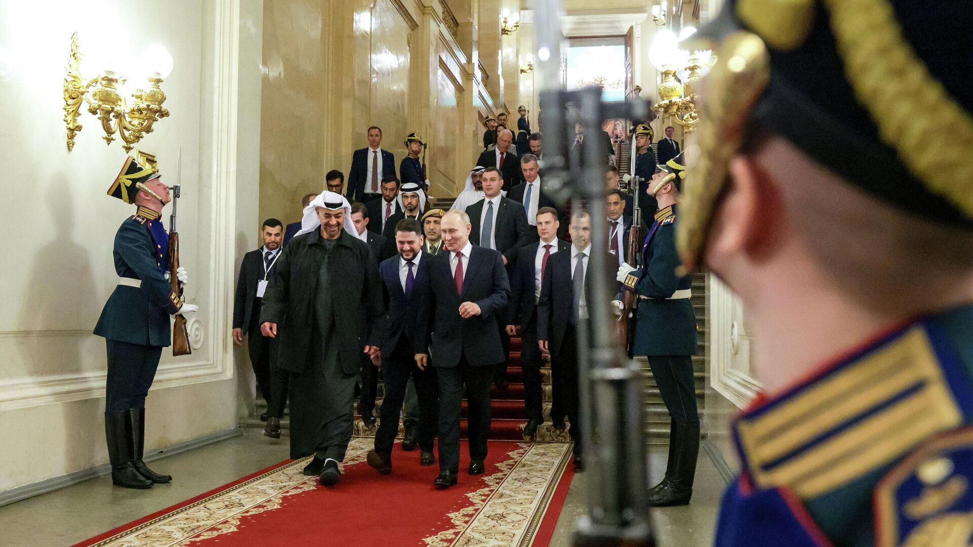 "Арабские Эмираты приехали в Москву в теплой одежде и уже на лестнице Кремля начали снимать пальто и куртки, продолжая делать это в залах Кремля", - рассказал журналист "России 1" Павел Зарубин.