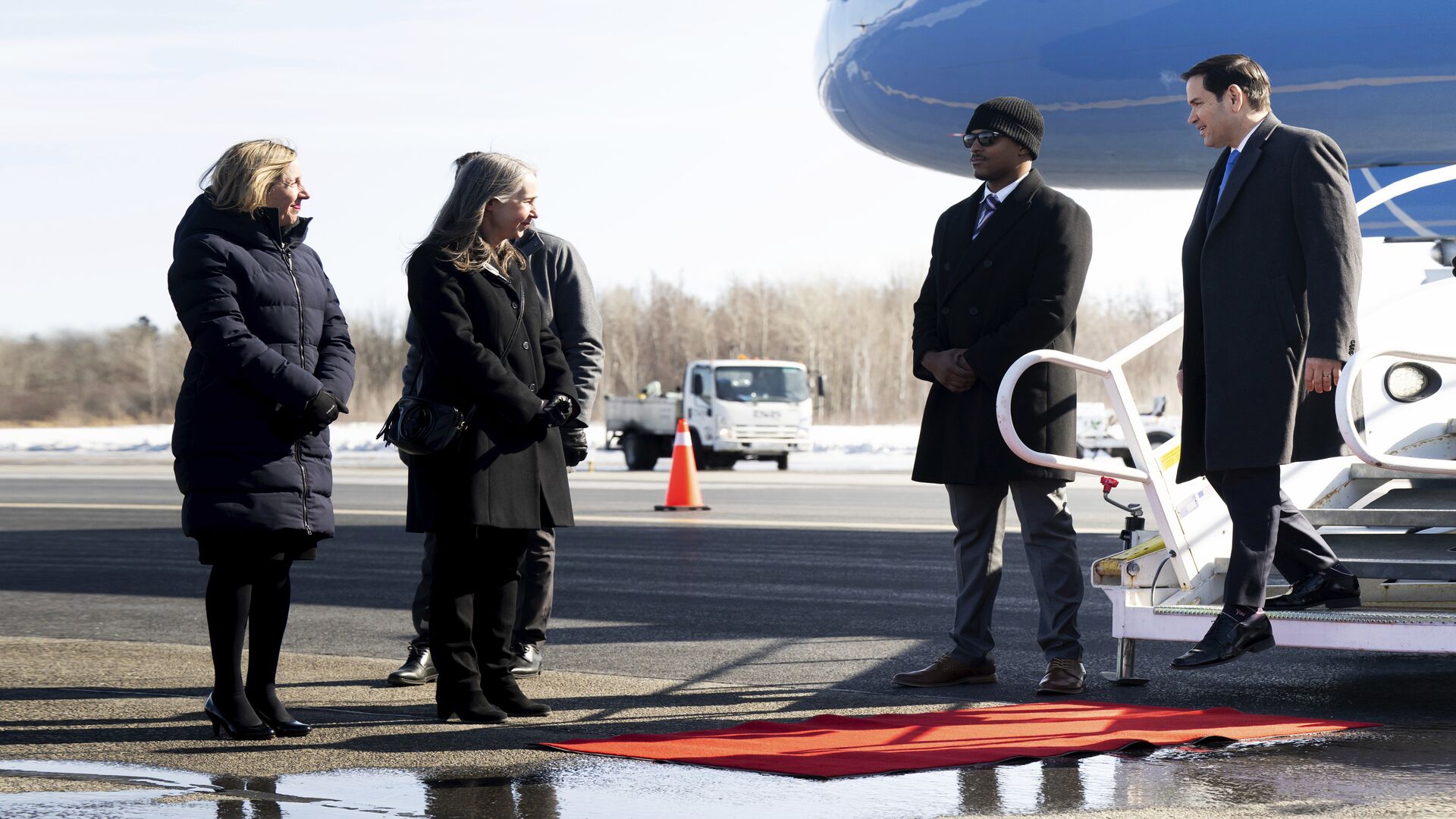 Госсекретарю США расстелили в Канаде короткую красную дорожку у лужи