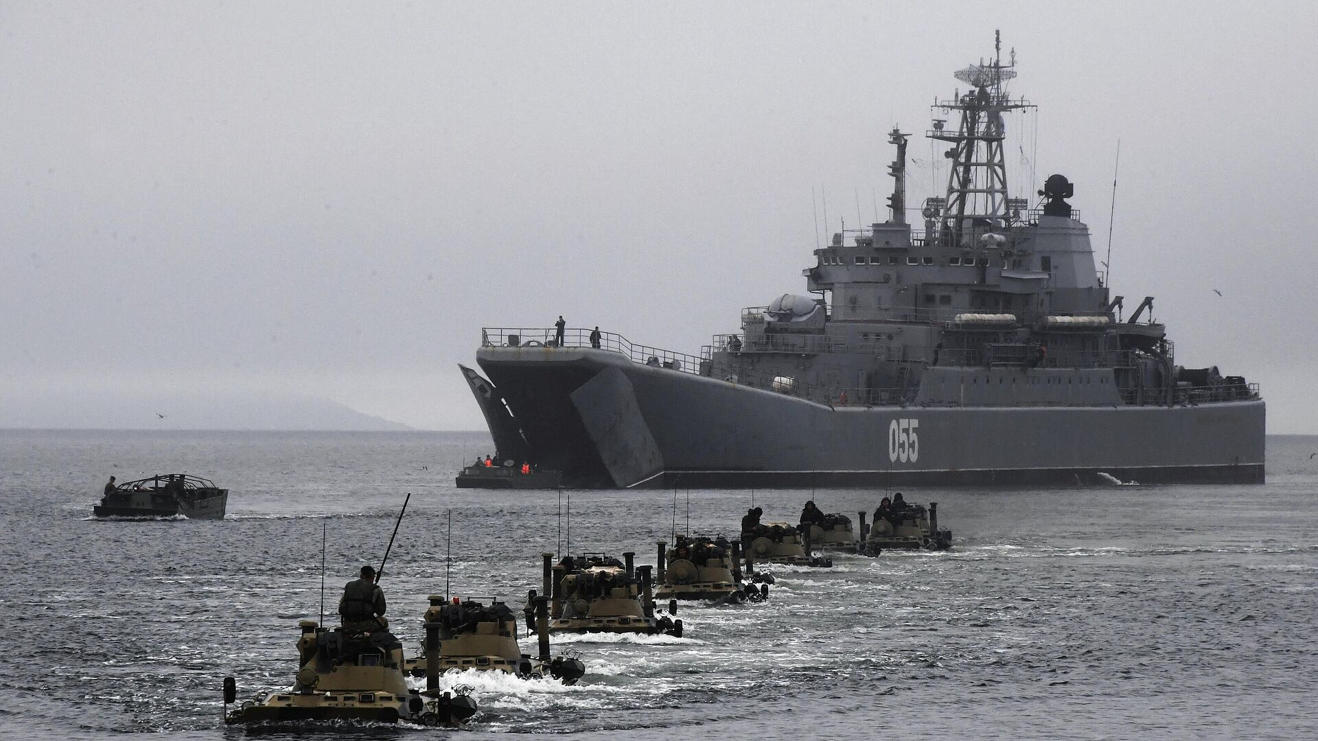 В ходе учения по высадке морского десанта Тихоокеанского флота большой десантный корабль "Пересвет" и десантные катера "Иван Карцов", "Андрей Иванов", "Д-70" и "Д-57" осуществили высадку военнослужащих и боевой техники на участок побережья условного противника.
