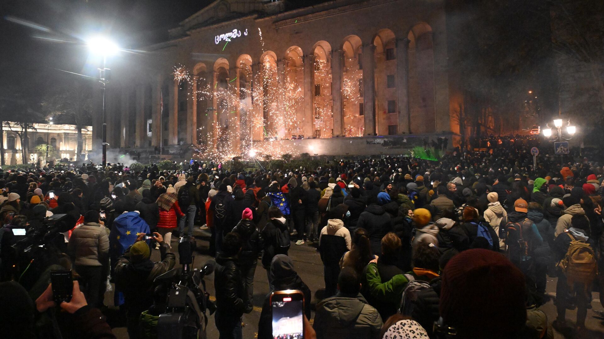 Протестующие снова собрались на проспекте Руставели в центре Тбилиси перед зданием грузинского парламента, это происходит уже 12-й вечер подряд. Серия акций протеста оппозиции началась в Грузии 28 ноября после заявления премьер-министра Ираклия Кобахидзе о приостановке рассмотрения вопроса о начале переговоров по членству страны в Евросоюзе до 2028 года. Участники акций используют петарды, камни, бутылки, а также были найдены на месте бутылки от "коктейля Молотова". Силовики в ответ применяют спецтехнику, включая водометы.