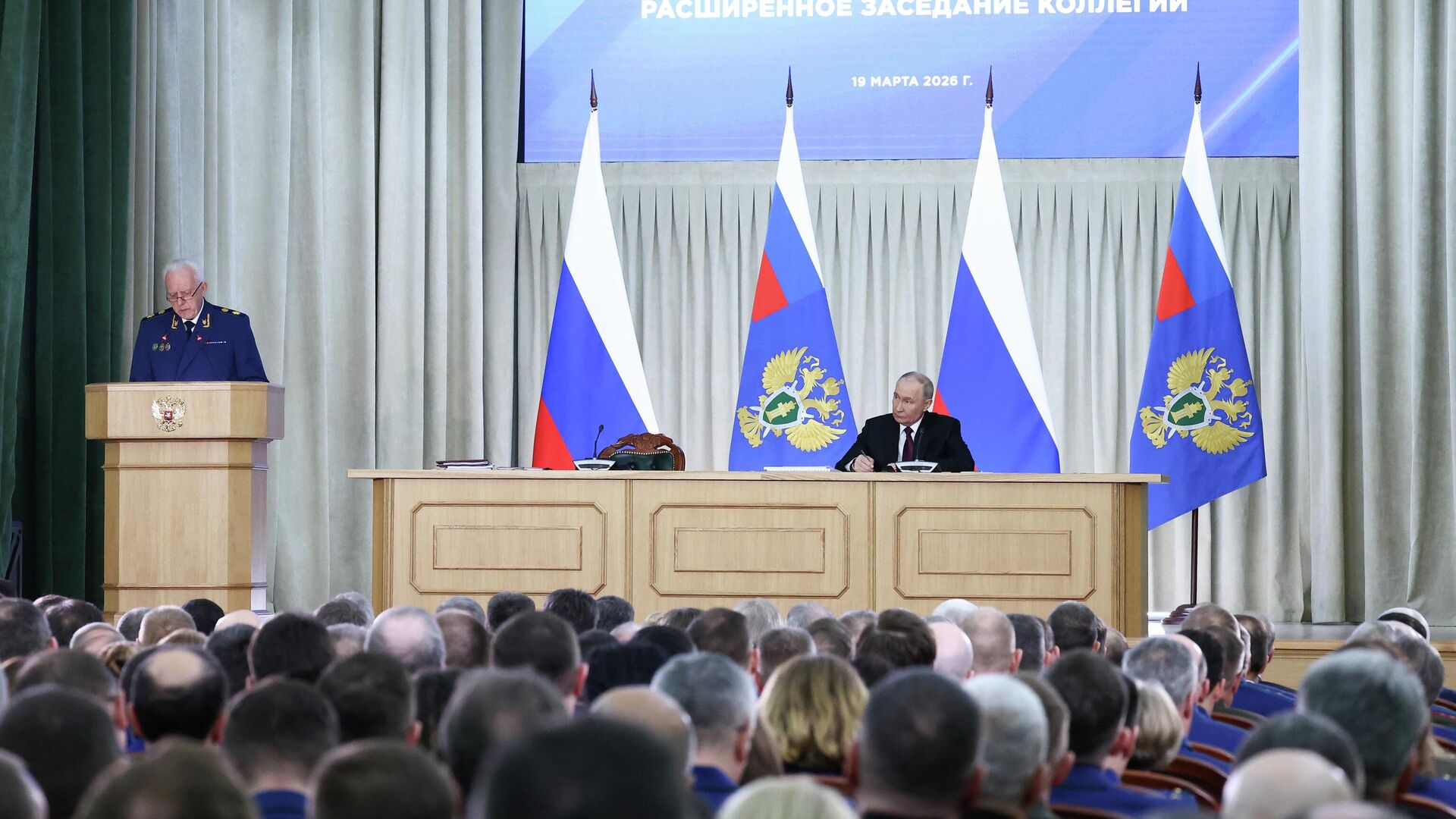 В четверг Путин принял участие в расширенном заседании коллегии Генпрокуратуры РФ, где выступил с речью. Также на мероприятии был представлен доклад генерального прокурора Александра Гуцана.
