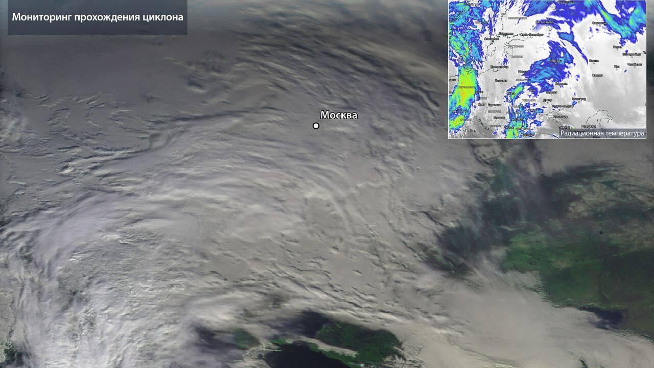"Роскосмос" опубликовал снимок циклона, который окутал Москву, сделанный российскими спутниками.
