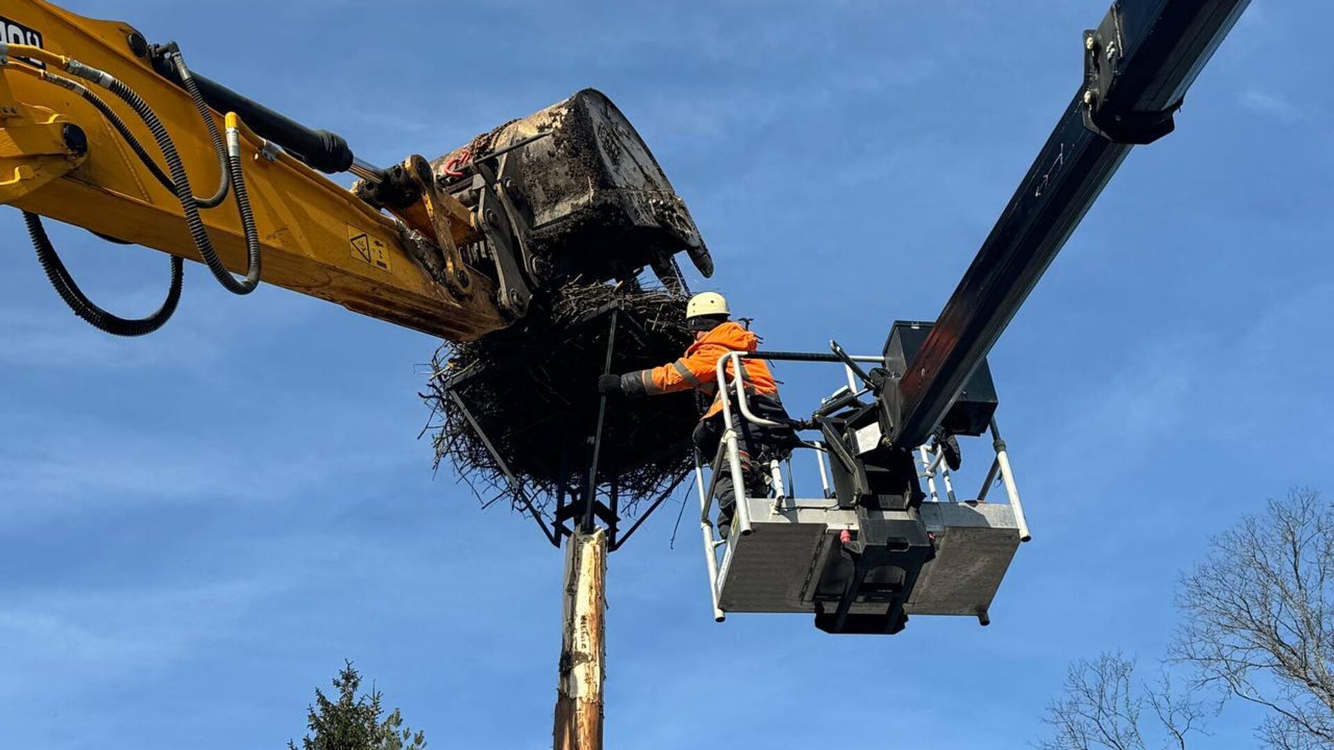 Дорожные работники в Ленинградской области перенесли гнездо белых аистов с старого дерева на новую опору в связи с ремонтом федеральной трассы Р-23.