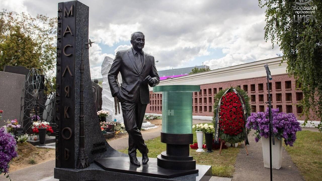 Памятник телеведущему Александру Маслякову был открыт на Новодевичьем кладбище в Москве, чтобы отметить первую годовщину его похорон.