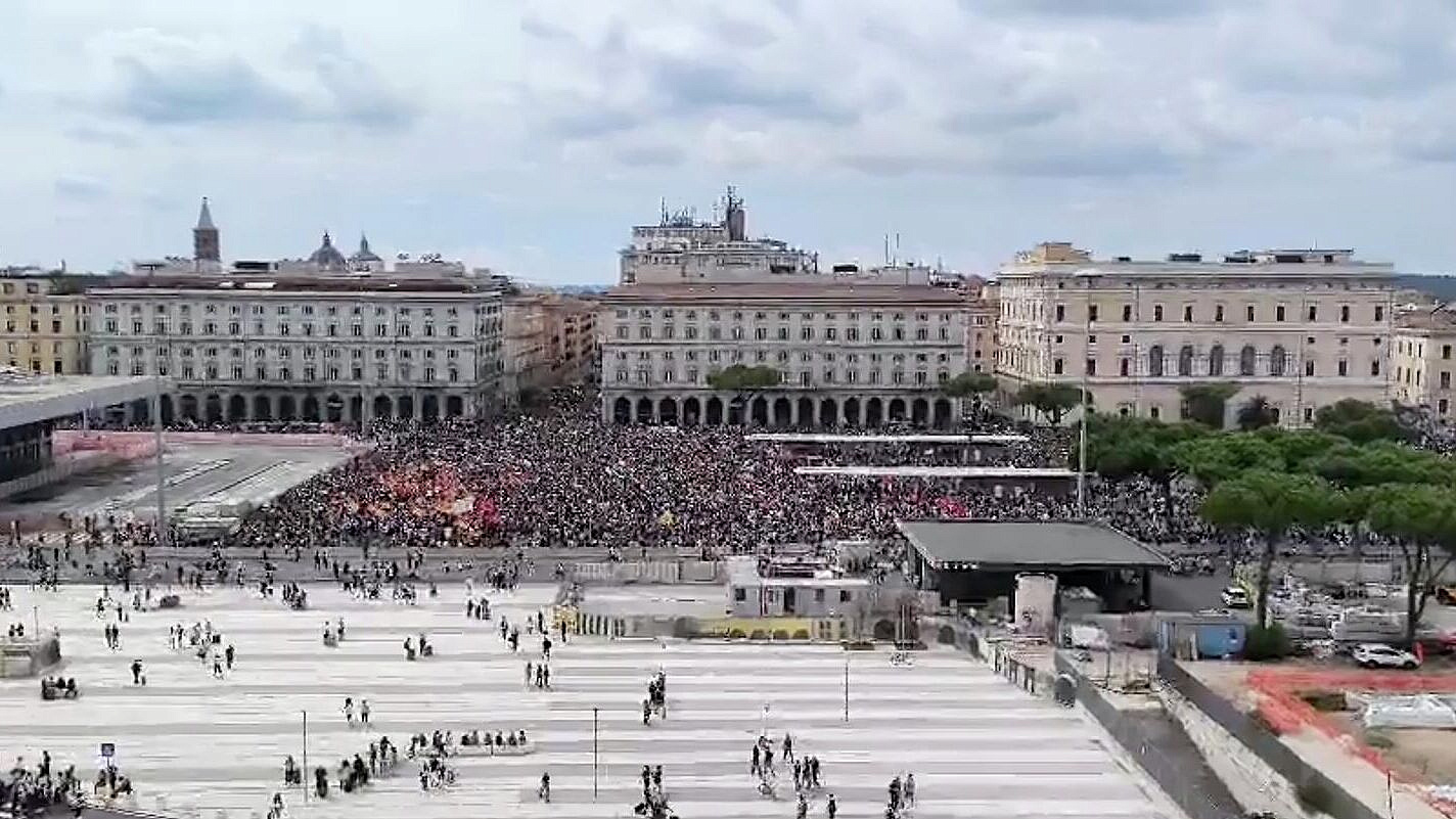 В центре Рима, на площади перед главным вокзалом "Термини", собралась огромная толпа людей, выступающих в поддержку палестинского народа.