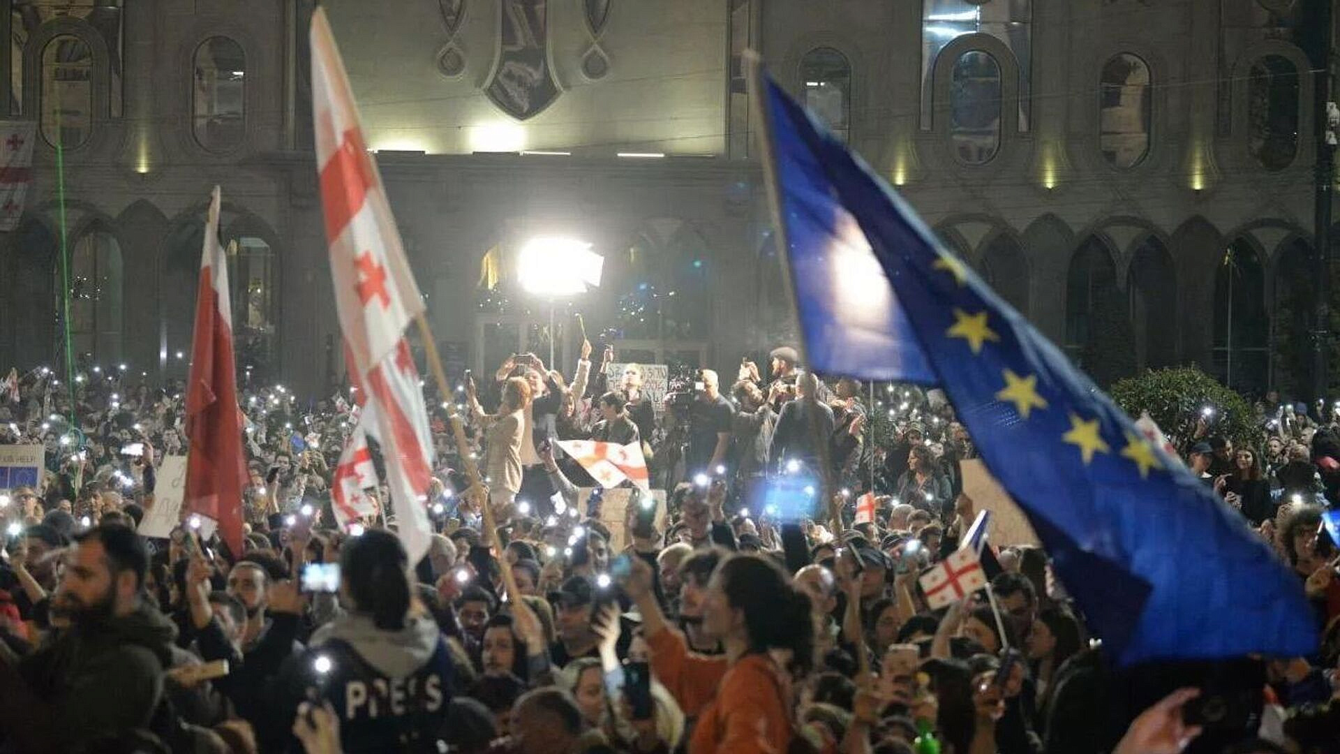 Силовые структуры в Тбилиси отошли от здания парламента и не принимают активных мер против протестующих, сообщает корреспондент РИА Новости.Источник и фото - ria.ru.