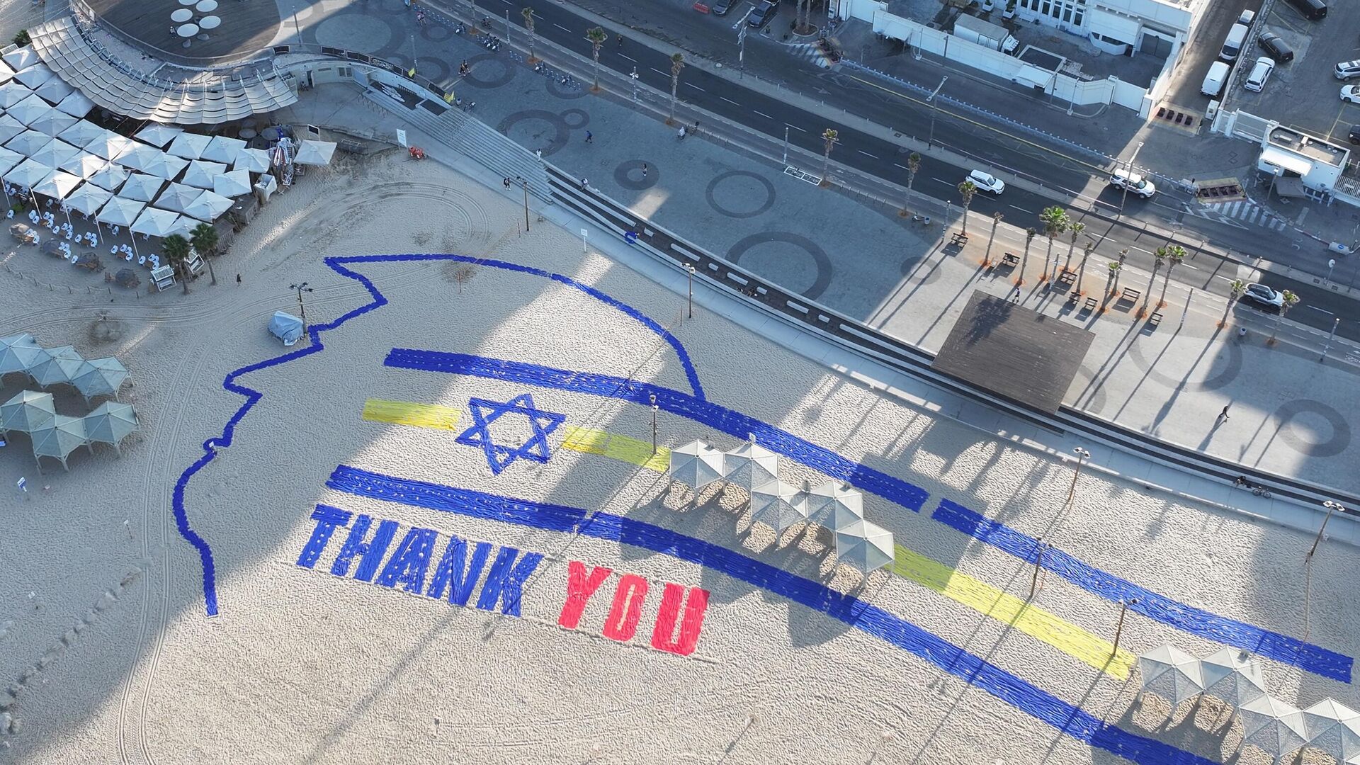 Во время прибытия президента США Дональда Трампа в Тель-Авив на пляже у посольства США был размещен яркий баннер с надписью "спасибо".