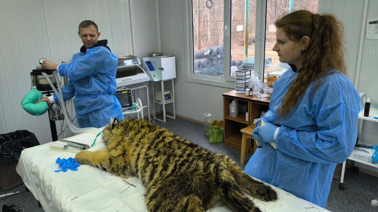 Ветеринары провели операцию по удалению молочных клыков амурскому тигренку, который остался без матери и был пойман в конце зимы в Ольгинском районе Приморья, сообщает Центр реабилитации тигров и других редких животных "Тигр". В феврале центр "Амурский тигр" сообщил о появлении одинокого тигренка в поселке Ольга. После осмотра было установлено, что это самец весом 30-40 килограммов и возрастом 4-5 месяцев, без матери. Зверь был истощен и слаб, поэтому ему была проведена операция по удалению молочных клыков. Операция прошла успешно, и врачи также провели дополнительные исследования. Амурский тигр - один из самых редких хищников на планете, численность которого в России оценивается примерно в 750 особей.