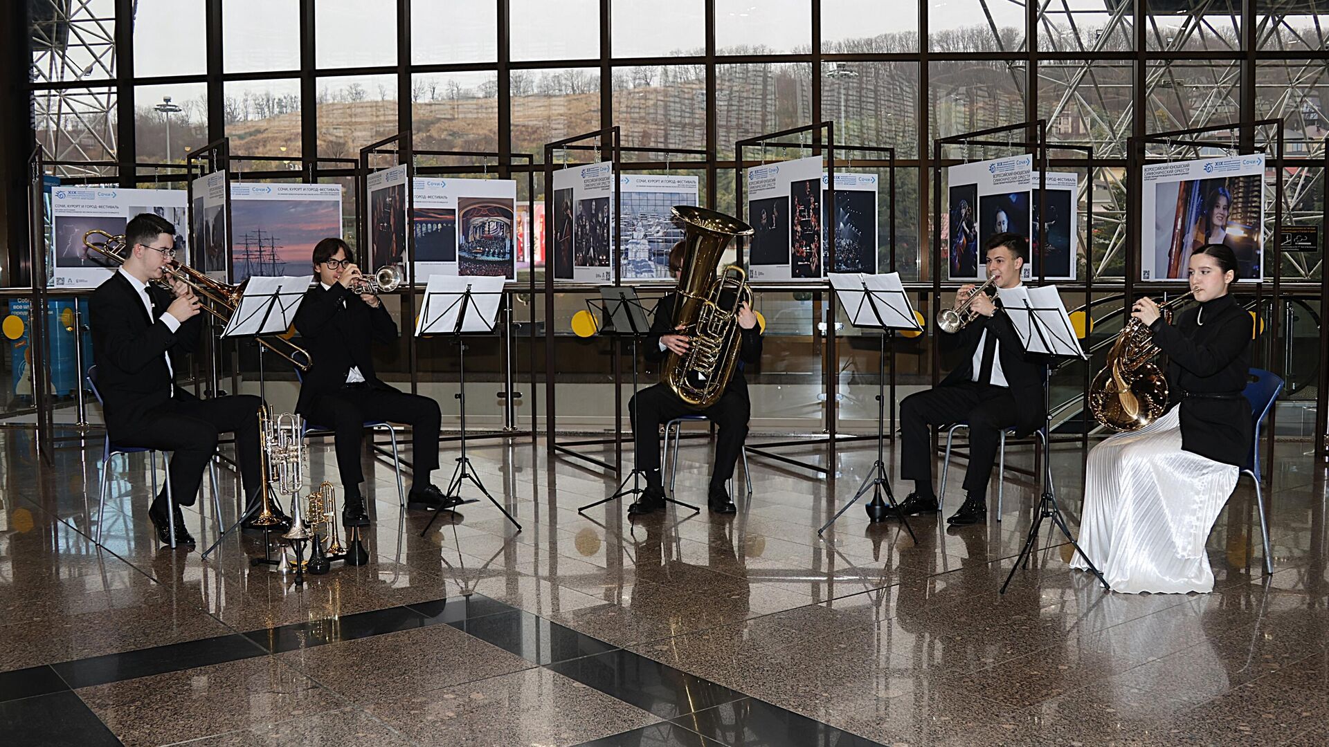 Брасс-ансамбль Всероссийского юношеского симфонического оркестра под руководством альтиста и дирижёра Юрия Башмета выступил в зале ожидания аэропорта Сочи, сообщили в сочинской авиагавани.