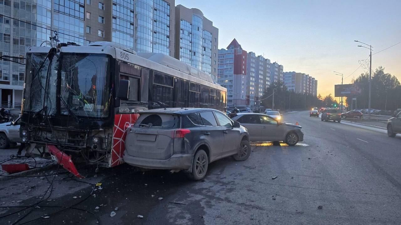 В Перми автобус врезался в пять машин и световую опору