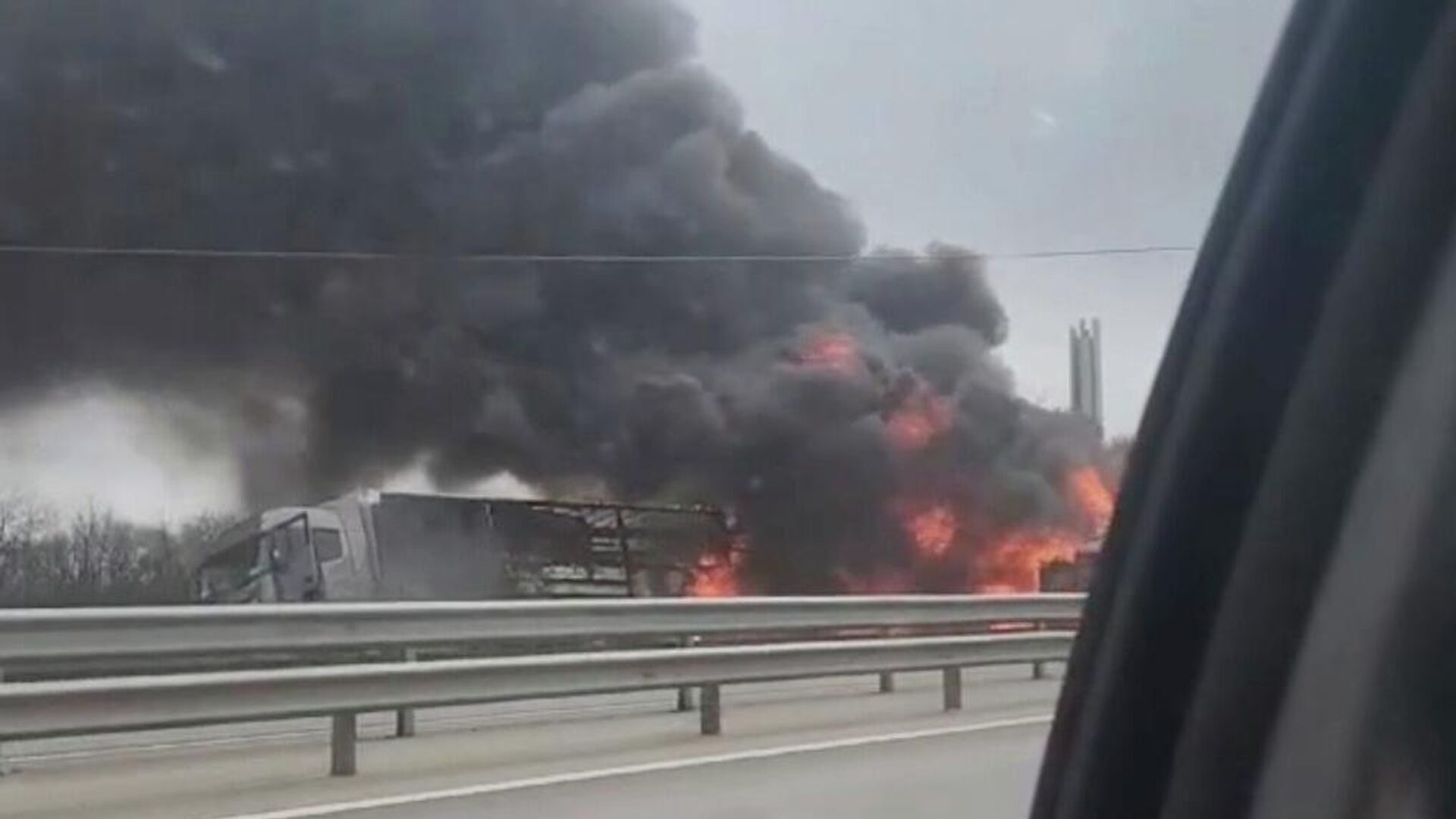 В местных Telegram-каналах появилось видео с места происшествия, на котором видно горящую фуру, лежащую на боку. Рядом, ближе к обочине, находится ещё один большегруз, тоже на боку, но без признаков возгорания.